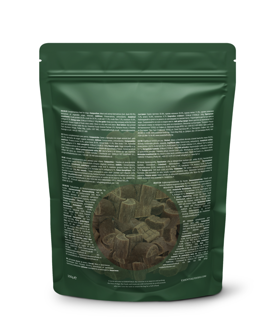 Ingrediënten: Vlees en dierlijke bijproducten (o.a. eend 90,5%), plantaardige bijproducten, mineralen.