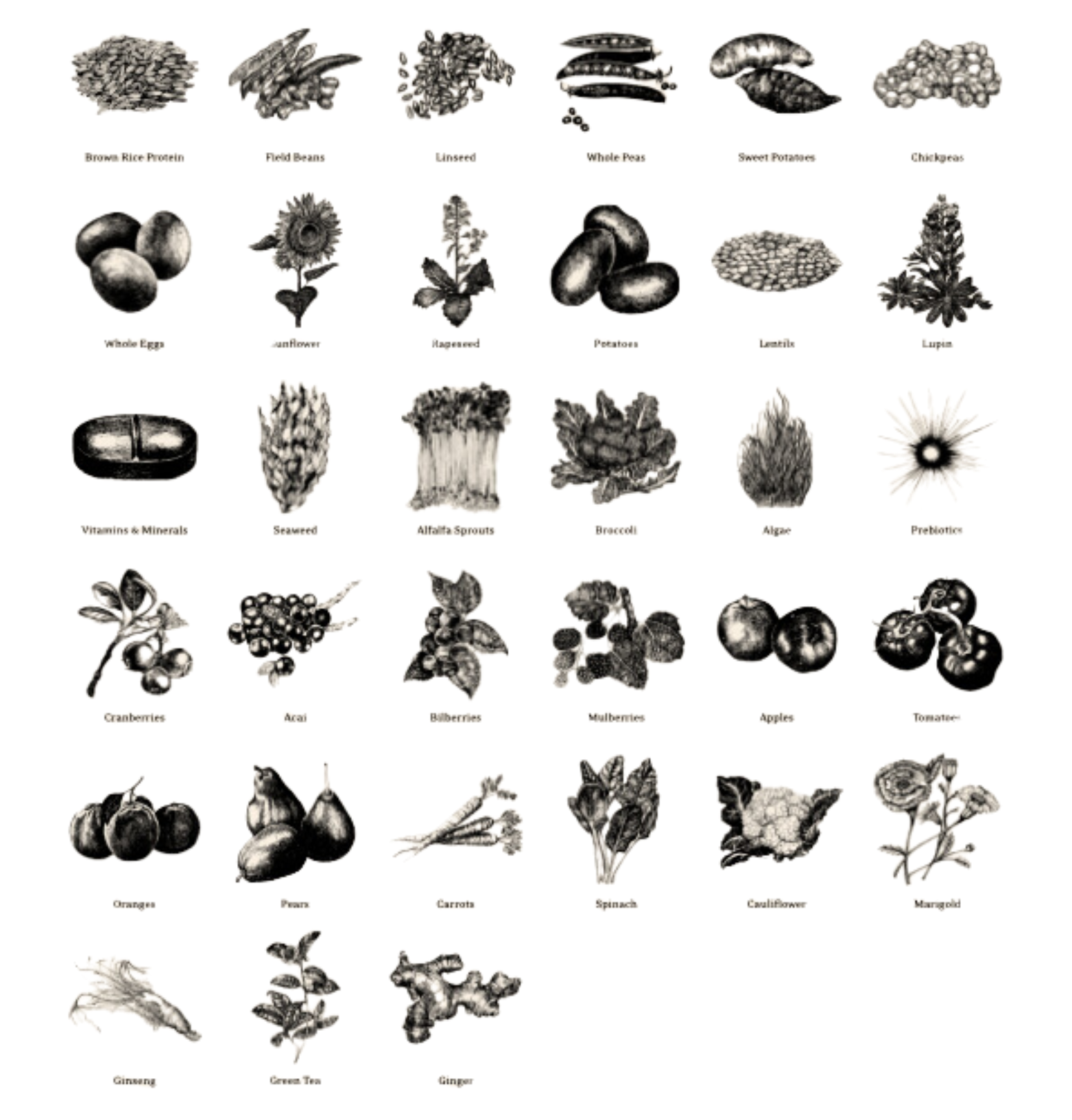 Bruine rijstproteïne, eieren, veldbonen, lijnzaad, erwten, aardappelen, kikkererwten, lupine en linzen 79,0% Waarvan vers (als % van het totale recept) 50,0 % Groenten, zaden, kruiden, bessen, fruit, vitaminen, mineralen 26,0 %