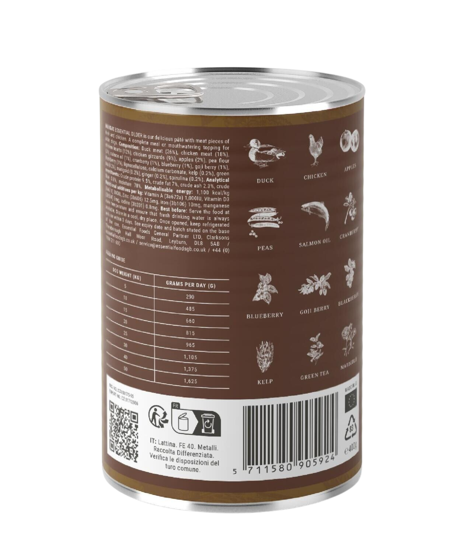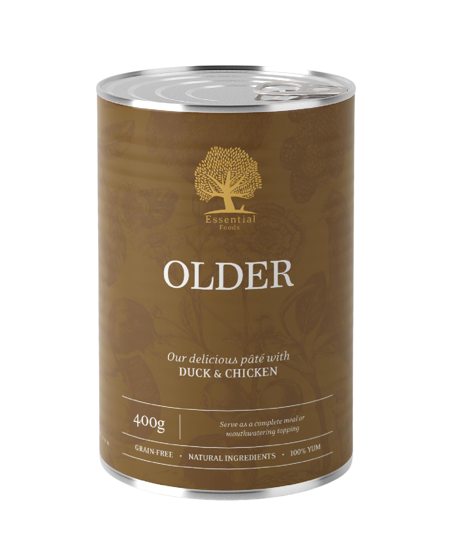 Essential Older Pâté is een heerlijke paté met stukjes eend en kip, afgestemd op de behoeften van oudere honden. Een complete maaltijd of overheerlijke topping die een zachte spijsvertering biedt, iets wat senioren vaak waarderen.